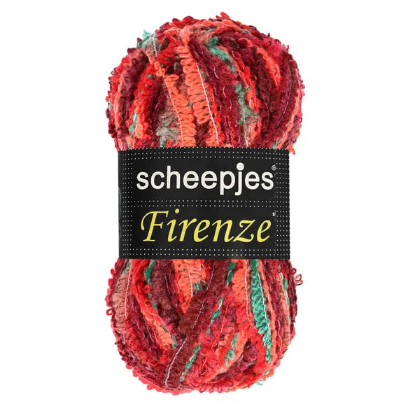 Scheepjes Firenze is a textured yarn with a looped construction, creating tactile and cosy garments and accessories with a unique appearance. This yarn is made from wool, acryl, polyester and polyamide and is supplied in 100g balls. Recommended needle/hook size is 6.00mm.